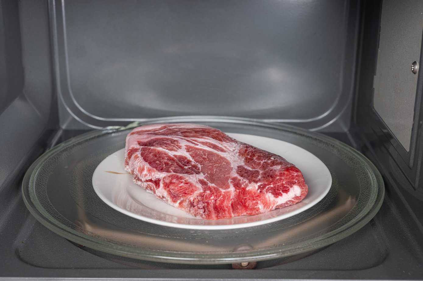 If you have a microwave, chances are you have a defrost button. This setting reduces the power of the microwave heating to promote a gentler defrost. If using a microwave to defrost meat, check and turn it frequently.