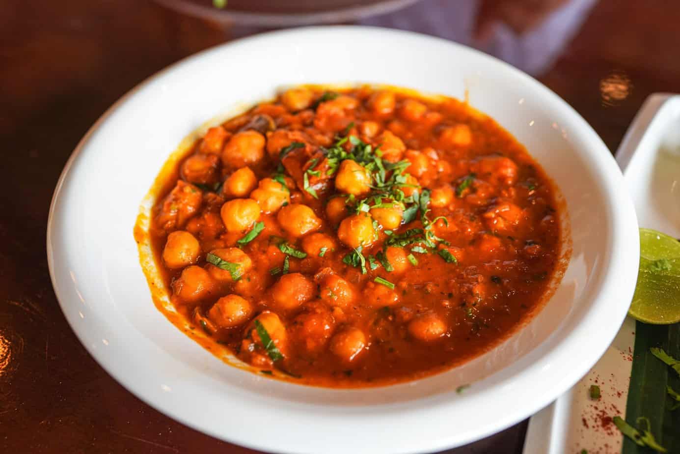 Chana masala is an Indian chickpea curry with a delicious tomato and onion masala gravy. It uses a blend of spices, including cumin, turmeric, coriander, and garam masala, for a rich and varied flavor. The chickpeas make this dish quite filling, and it’s often served over rice or with Naan.