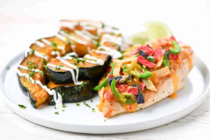 - Monterey Jack Smothered Chicken with Creamy Mushroom Sauce & Roasted Summer Squash