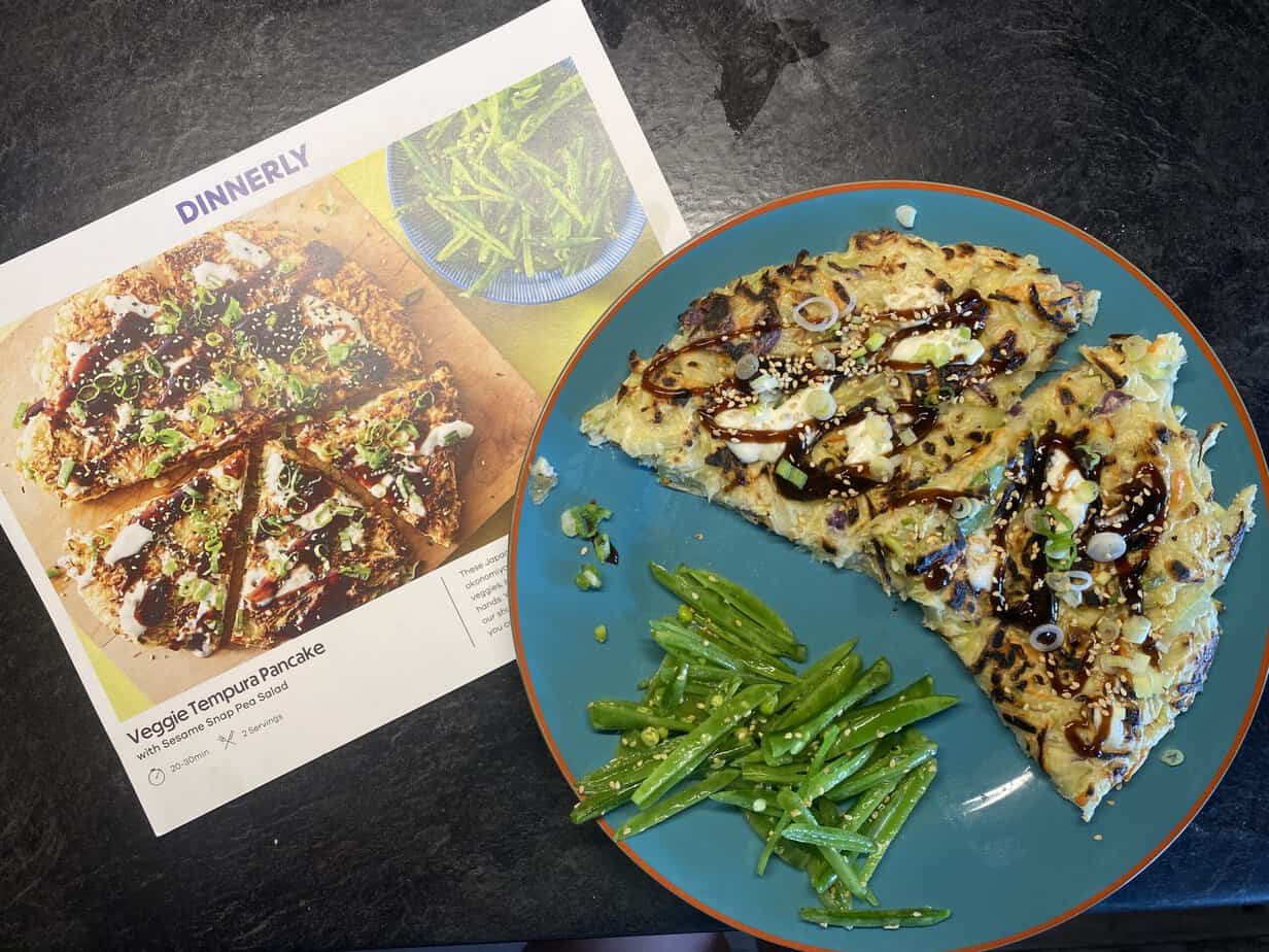 With Dinnerly, we were impressed with the Veggie Tempura Pancake with Sesame Snap Pea Salad. This creative and unique dish packs in tasty flavors with few ingredients. We loved the tempura pancake, which uses a simple batter to coat fresh cabbage for a satisfying crunch, and the lovely bright side salad of sesame snap peas. The hoisin sauce and garlic mayo on top of the pancake were just the right pop of flavor with minimal effort!