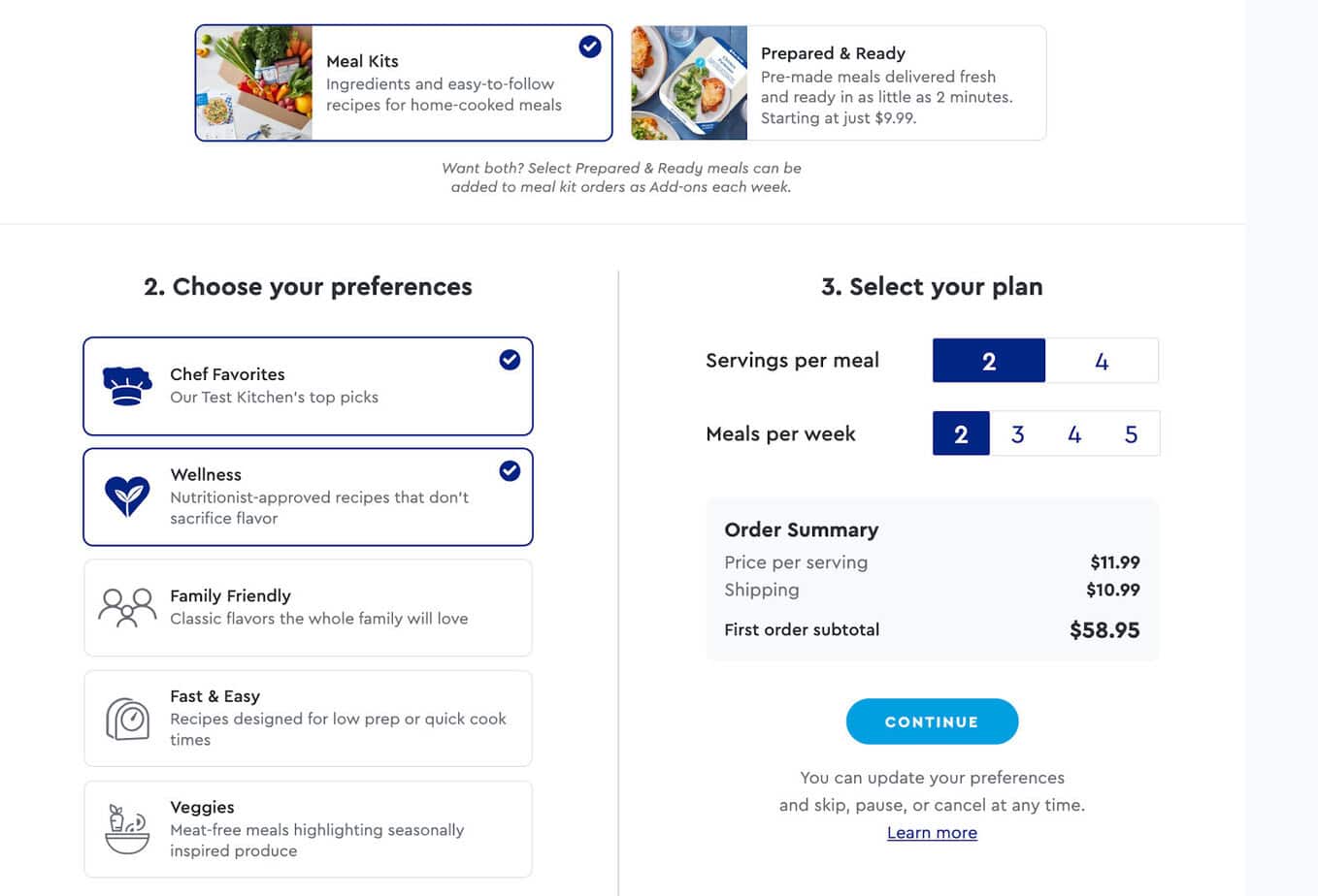During sign-up, you can specify preferences to get weekly recommendations from the full menu of 80+ recipes, choosing from Chef Favorites, Wellness, Family Friendly, Fast & Easy, or Veggies. Blue Apron customers can also shop add-ons, including breakfast, quick lunches, desserts, and more.