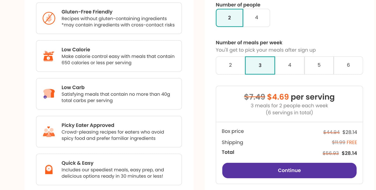 Each meal kit delivery company has a straightforward process for subscribing and managing your account online or in their mobile app. You simply follow the onscreen directions and prompts, which allow you to note dietary preferences, box size, number of portions, delivery information, etc. Then, you can pick your meals for the first week!