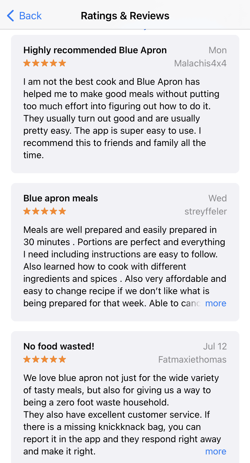 In the Apple App Store, the Blue Apron app has an average rating of 4.7/5 with over 40K ratings and reviews. Here’s a quick snapshot of what customers had to say: