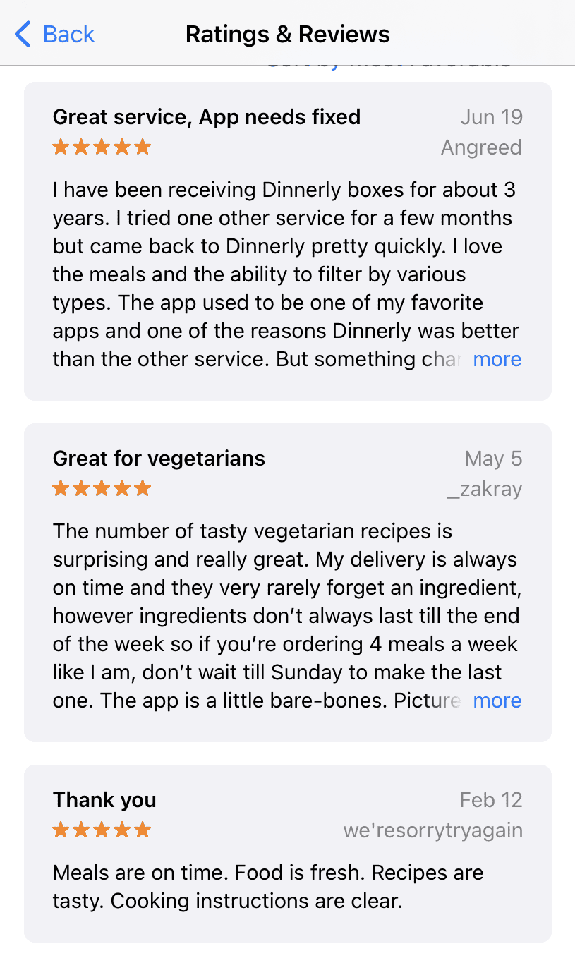 The Dinnerly app has an average score of 4.7/5 stars in the Apple App Store, with over 6.1K ratings. Here are a few recent customer reviews: