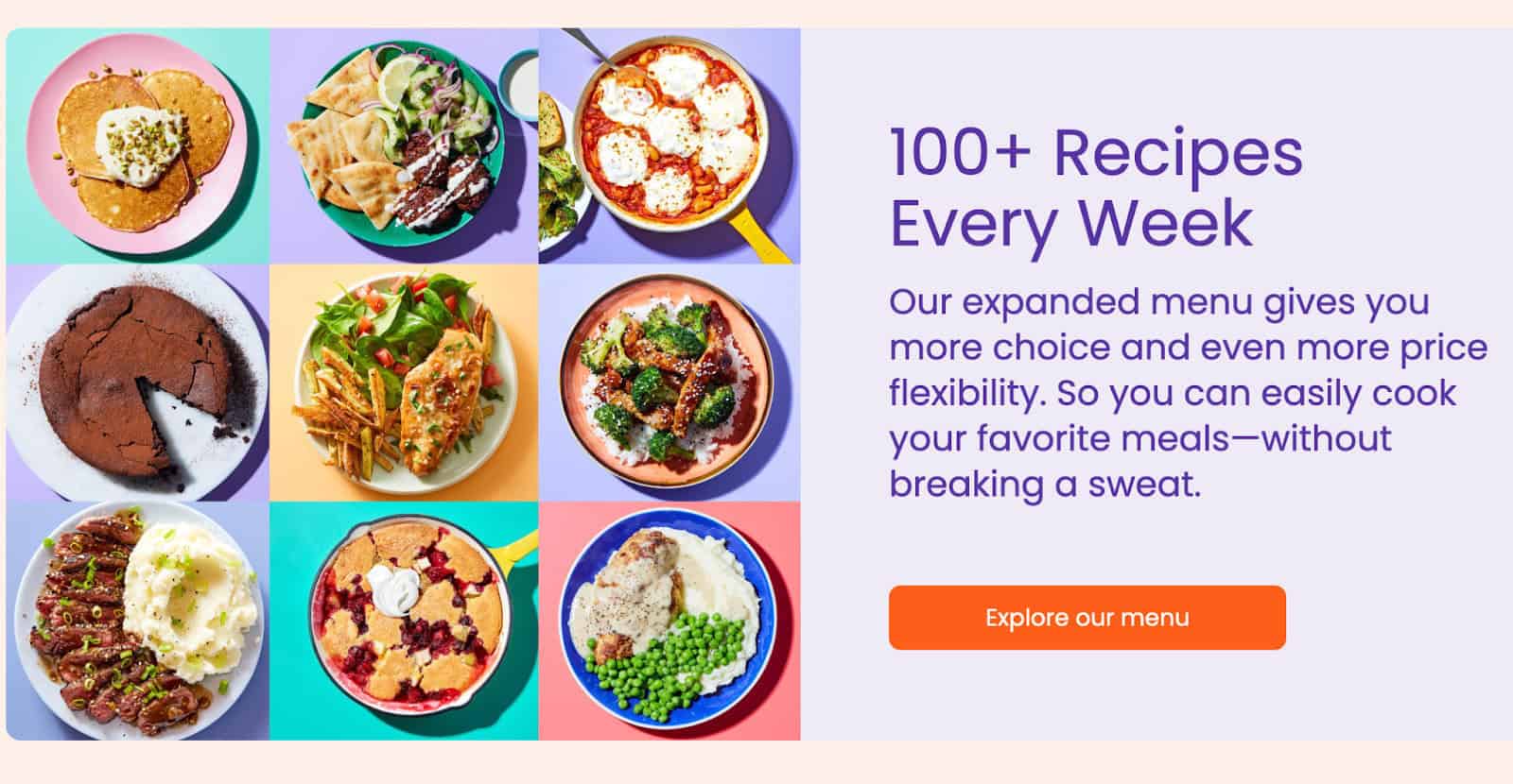 - Menu Variety: Over 100 recipes weekly, including breakfast, lunch, and snack add-ons.