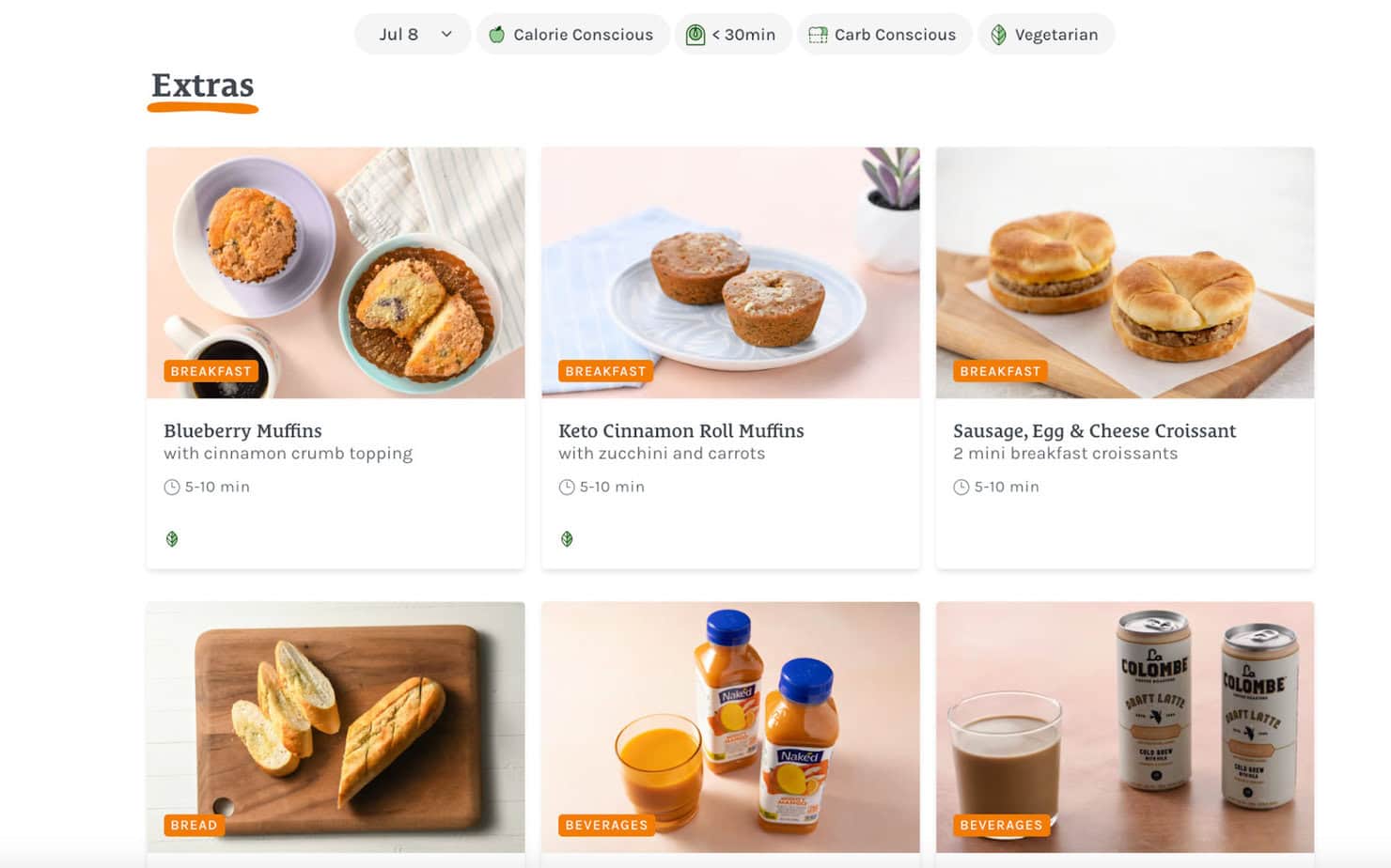 Green Chef has an extensive add-on menu called Green Market. You can choose from premade breakfasts, lunches, snacks, desserts, and beverages. They also offer extra protein and veggie packs, side dishes, appetizers, and vitamins.