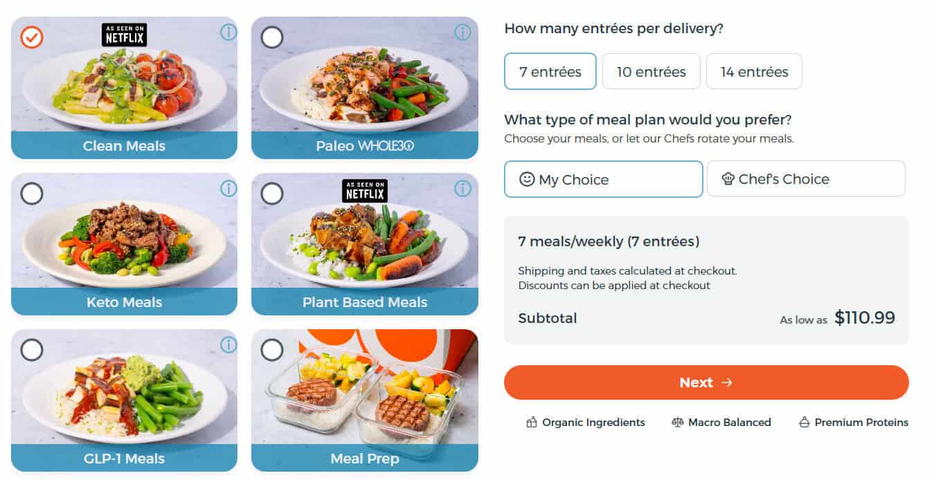 After choosing a plan, you can also decide how many entrees you want per week, from 7, 10, or 14. You will also choose whether to pick your own meals every week or go fully automated with the Chef’s Choice plan, where Trifecta’s chefs will pick your meals for you.