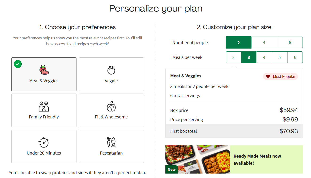 With HelloFresh, you’ll pick from six dietary preferences when signing up to help personalize your plan. The options are a standard Meat & Veggies plan, a plant-based Veggie option, Family Friendly, Fit & Wholesome, Under 20 Minutes, or meals for a Pescatarian diet.