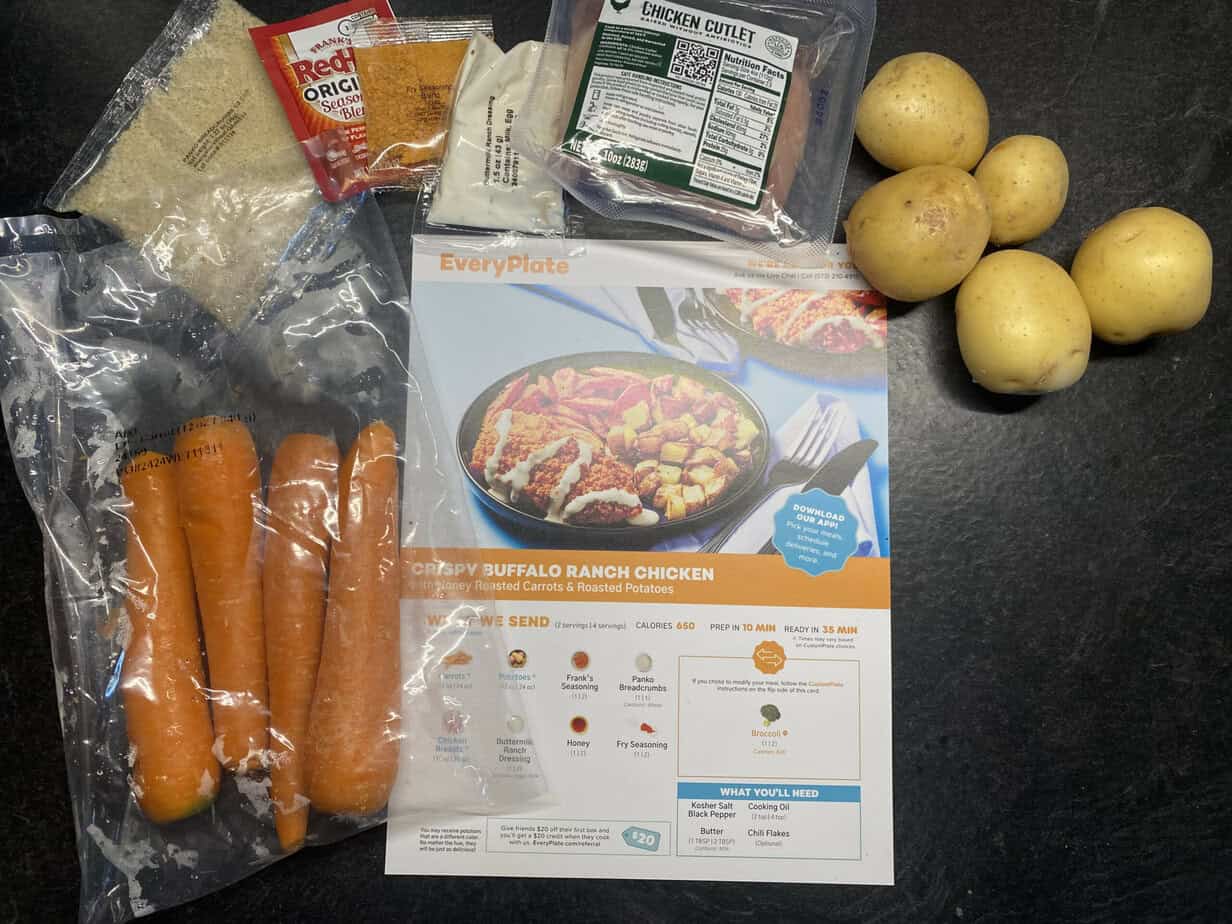 EveryPlate’s weekly menu has some great flexible options with their CustomPlate offering. This lets you swap out certain ingredients in a recipe, choosing a different protein or veggie to suit your preferences. For instance, with the Crispy Buffalo Ranch Chicken, you can swap them for broccoli if you don’t like or can’t eat carrots. Many meals are available with a meat-free option for vegetarians.